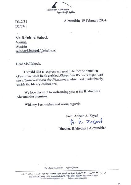 Am Ende doch noch ein Lichtblick: Im Februar erreichte mich ein persönliches Schreiben von Prof. Ahmed A. ZaYed, dem Direktor der Bibliothek von Alexandria. Er ließ mich wissen, dass mein „wertvolles Buch KLEOPATRAS WUNDERLAMPE“ in die Sammlung „aufgenommen wurde und zweifellos den Bestand der Bibliothek bereichert.“ Na, bitte, Kleopatra ist erleuchtet!